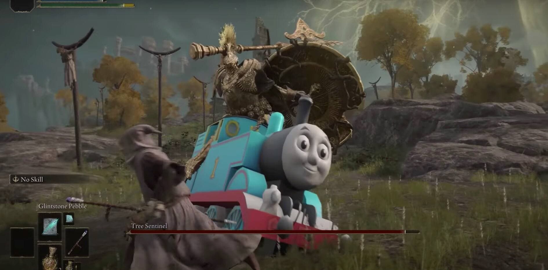 Le moddeur skymoon présente, dans sa vidéo, un test de son mod qui remplace la monture du Tree Sentinal, le premier mini boss qu’on rencontre à notre arrivée dans la première zone du jeu, Limgrave. Le joueur appelle ensuite sa monture, qui elle aussi a été remplacée par Thomas le petit train.