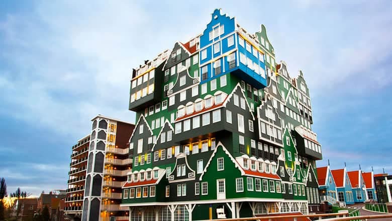 Cet hôtel d’Amsterdam propose des façades originales inspirées des maisons traditionnelles de la région de Zaan, au Pays-Bas. Bien que l’extérieure de l’hôtel soit plus traditionnelle, l’intérieur offre un environnement moderne.
