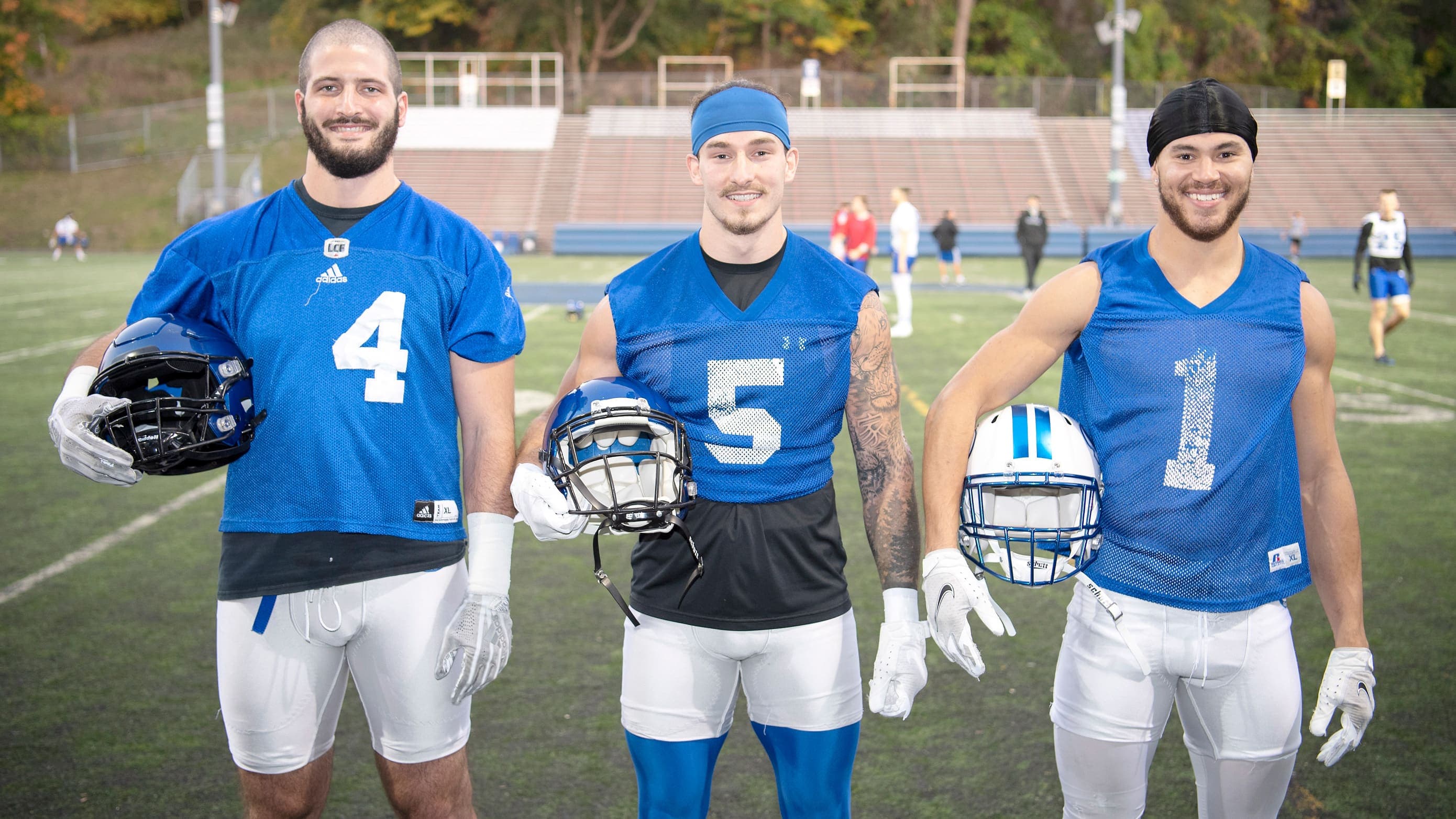 Marco Iadeluca (entraîneur-chef de football) est en compagnie du légendaire quart-arrière des Alouettes, Anthony Calvillo (coordonnateur offensif de football) ainsi que Pat Raimond et Kevin McConnell (entraîneurs-chefs de soccer masculin et féminin).