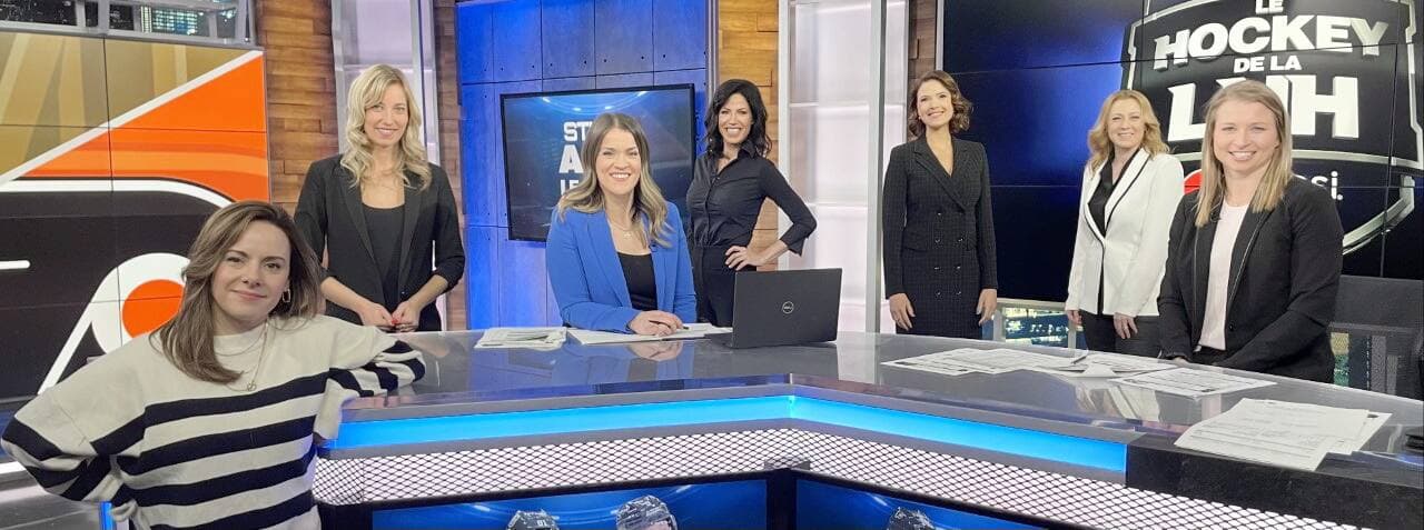 Dans le cadre de l’émission du Match de LNH, on voyait Mélanie Leclerc, à la réalisation, Marie-Soleil Desjardins, la productrice, Justine St-Martin, qui a animé l’émission, Claude Guillet, analyste, Élizabeth Rancourt, coanimatrice de l’émission L’après-match, Isabelle Éthier, qui est très impliquée dans le monde du hockey et Ann-Sophie Bettez, analyste.