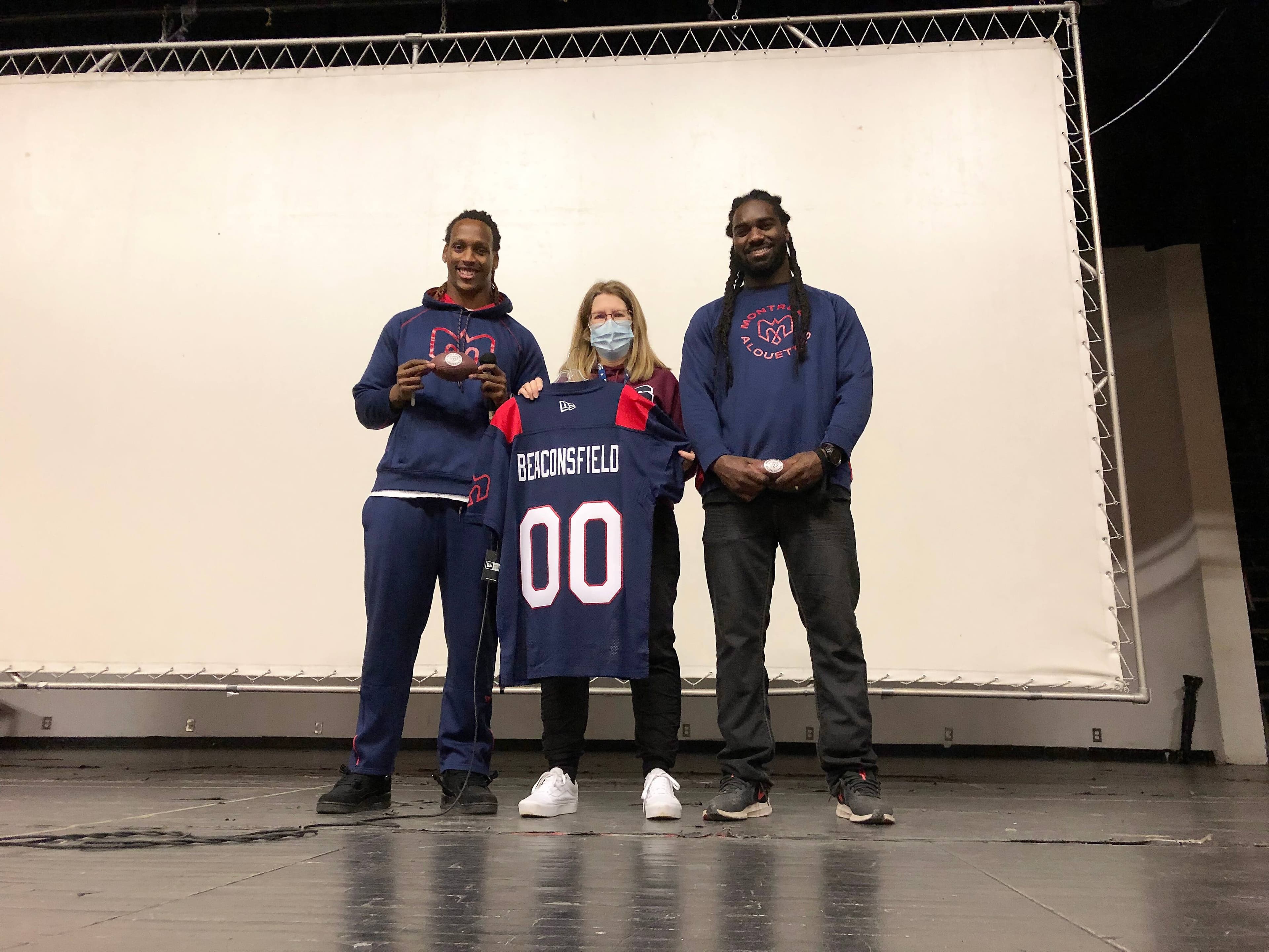 Lors de leur visite à l’école secondaire Beaconsfield, dans le cadre du Mois de l’histoire des Noirs, les joueurs québécois des Alouettes, Kerfalla Exumé et Brian Harelimana ont remis un chandail des Alouettes à Sue Larivière, la directrice adjointe.