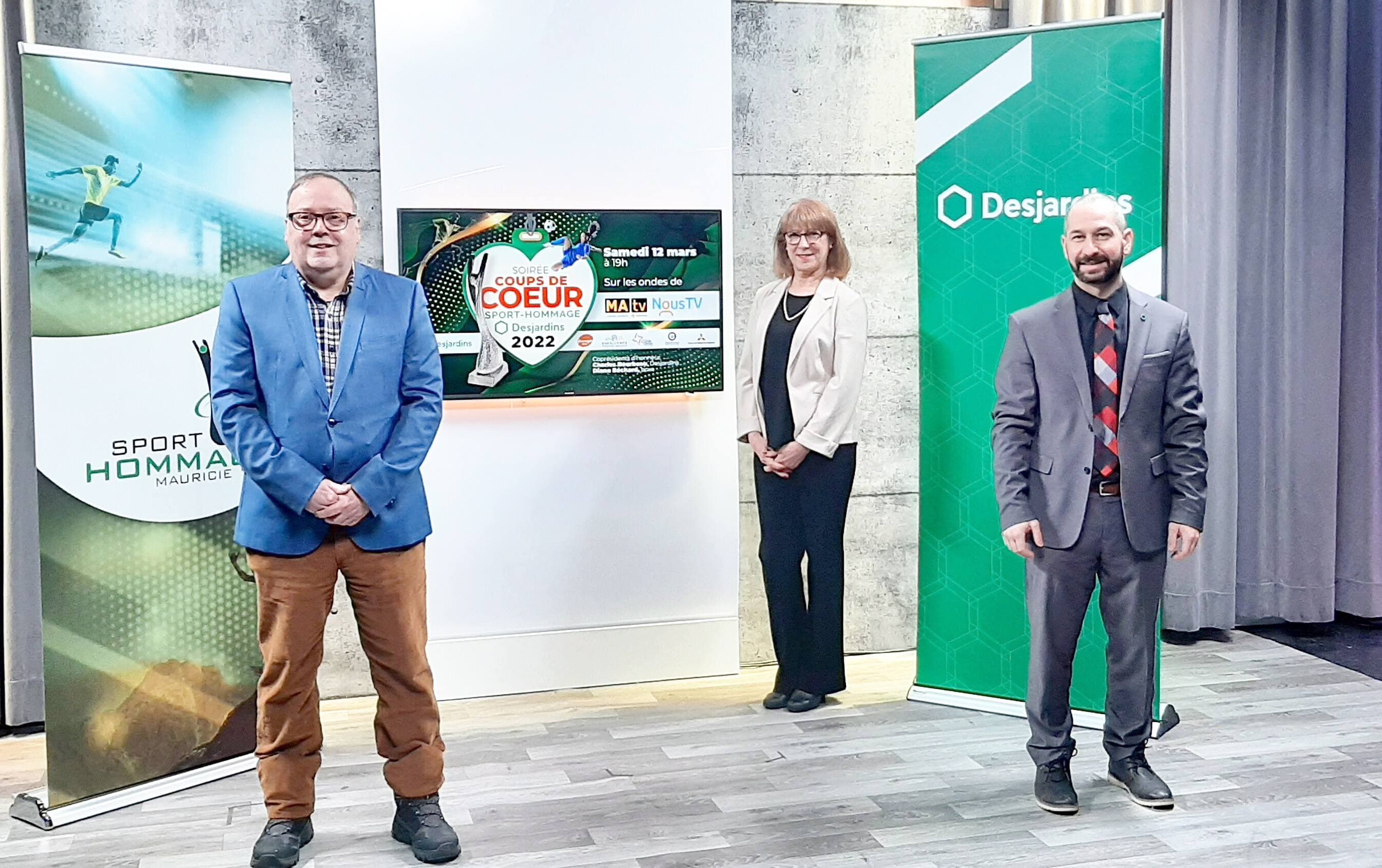 André Beauchesne, le président de la Corporation Sport-Hommage Mauricie, est en compagnie des coprésidents d’honneur de la soirée gala, Diane Béchard et Charles Bourbeau, directeur de la Caisse Desjardins Mékinac-des-Chenaux.