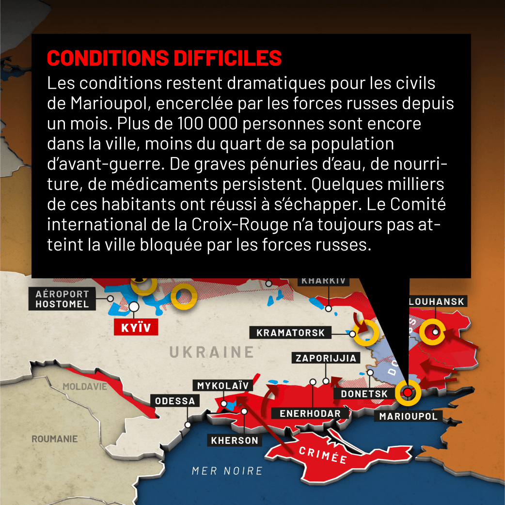 La Croix-Rouge a annoncé lundi que l'une de ses équipes, chargée d'aider à évacuer des civils de la ville portuaire assiégée de Marioupol (sud-est de l'Ukraine), était «retenue» par la police dans une localité proche, sous contrôle russe.