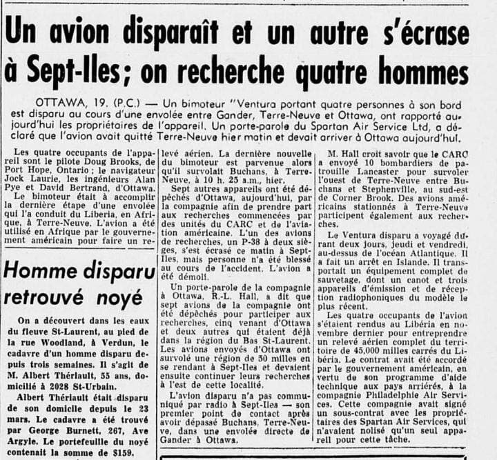 Plusieurs bombardiers et avions américains stationnés au Canada avaient «survolé une région de 50 milles en se rendant à Sept-Îles et devaient ensuite continuer leurs recherches à l’est de cette localité». Sans la moindre trace du Ventura, les autorités avaient cru que l’appareil s’était écrasé en mer.