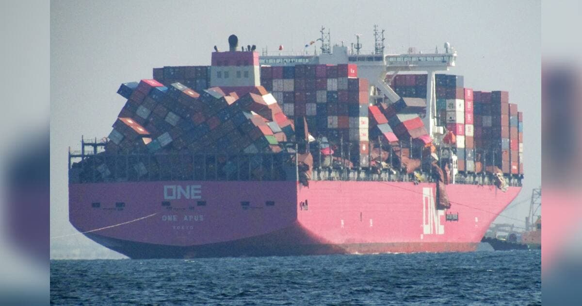 Le vaisseau Apus de la compagnie ONE (Ocean Network Express) a perdu très exactement 1816 conteneurs au fond de l’océan avant de récemment arriver au port de Kobe, au Japon.
