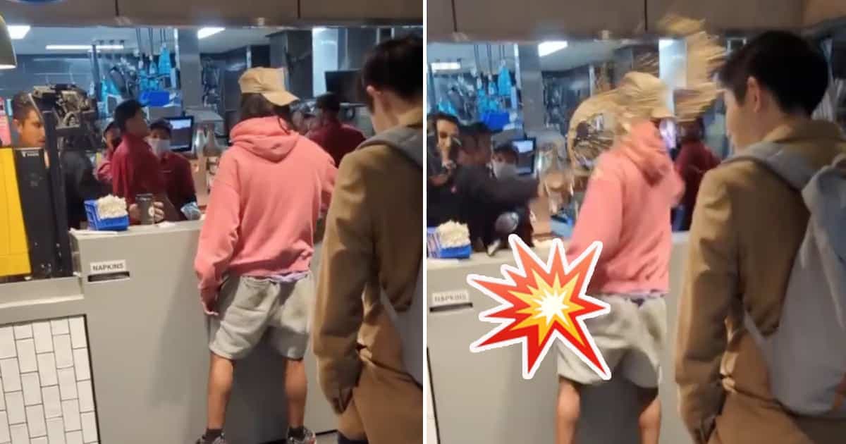 Sur la vidéo filmée dans le McDo dans le quartier Wynyard du centre-ville de Sydney, on peut voir un employé perdre les pédales et envoyer le contenu d’un gobelet de boisson gazeuse directement dans le visage d’un client.