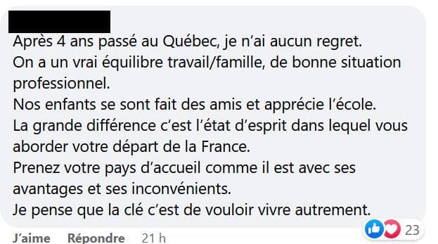 D’autres, installés au pays depuis plus longtemps, font preuve de plus d’empathie. Le fait que son pays d’origine lui manque et qu’il l’idéalise est tout à fait normal, soulignent des expatriés. Certains expliquent plutôt pourquoi ils ne voudraient plus quitter le Québec pour retourner France.
