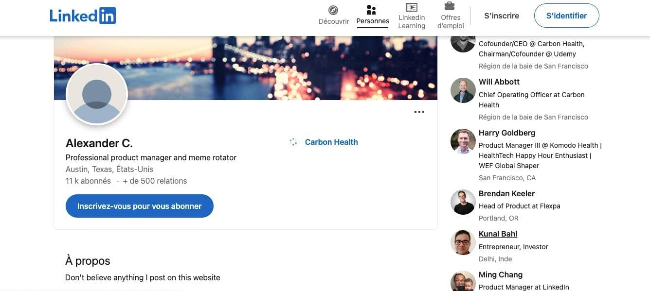 Mais très peu remarquent qu’à la base, cela est apparu sur un profil LinkedIn où on peut lire «Don’t believe anything I post on this website» (ou, en français, «Ne croyez rien de ce que je publie sur ce site web) dans la section «À propos».