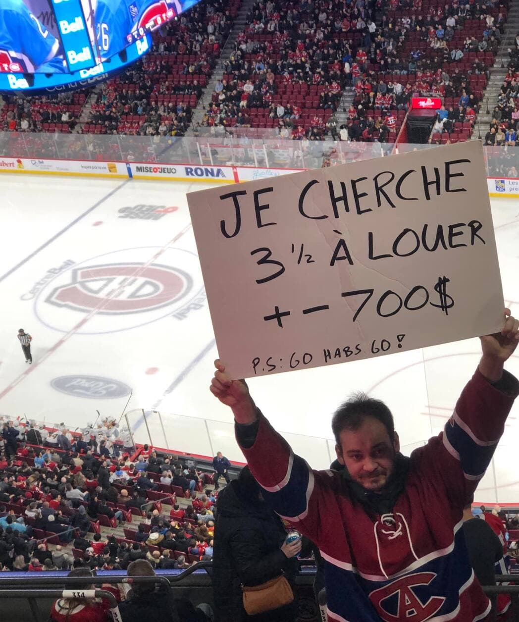 Lors de la rencontre opposant le Canadien aux Panthers de la Floride jeudi, Portelance et son ami se sont présentés au Centre Bell avec une affiche qui était en fait un avis de recherche pour un logement.