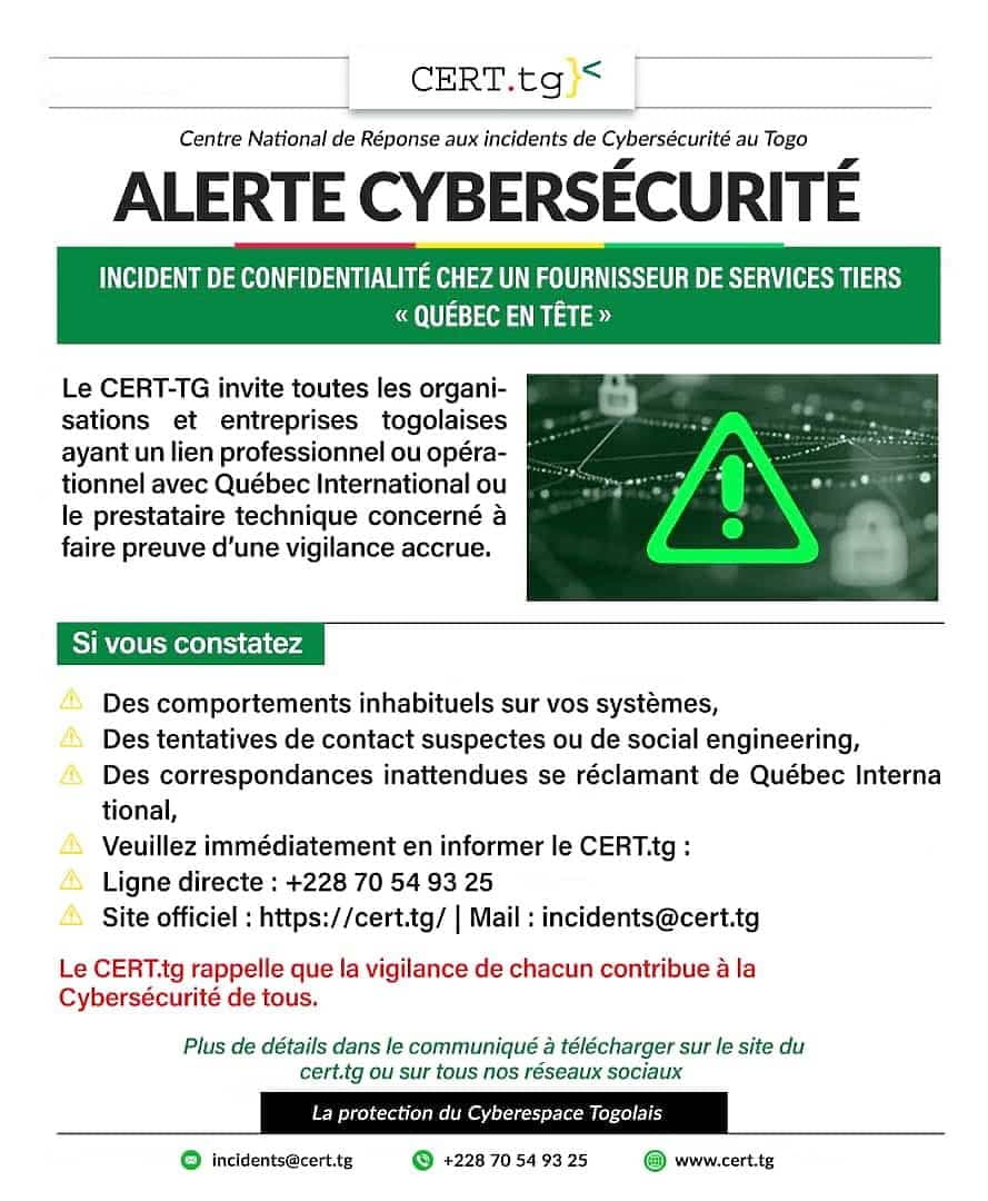 Le centre national de réponse aux incidents de cybersécurité du Togo (CERT) a émis une alerte le 18 juillet reprenant les éléments du courriel de Québec International.