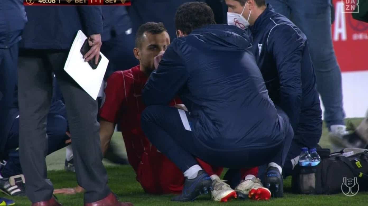 Le derby sévillan est arrêté depuis l'égalisation de Nabil Fekir (Betis Séville), peu avant la mi-temps. Le joueur du FC Séville Joan Jordan a été touché par un projectile #lequipeFOOT pic.twitter.com/w7QEBDdH11