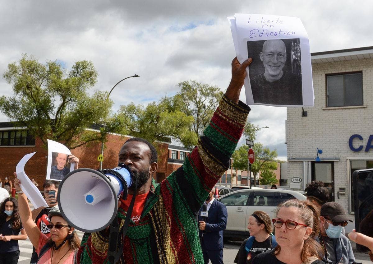 Il s'agissait d'une manifestation en appui à cet enseignant, Patrice Trudeau, qui est a été envoyé à la maison avec salaire parce qu'il aurait véhiculé en classe des propos complotistes.