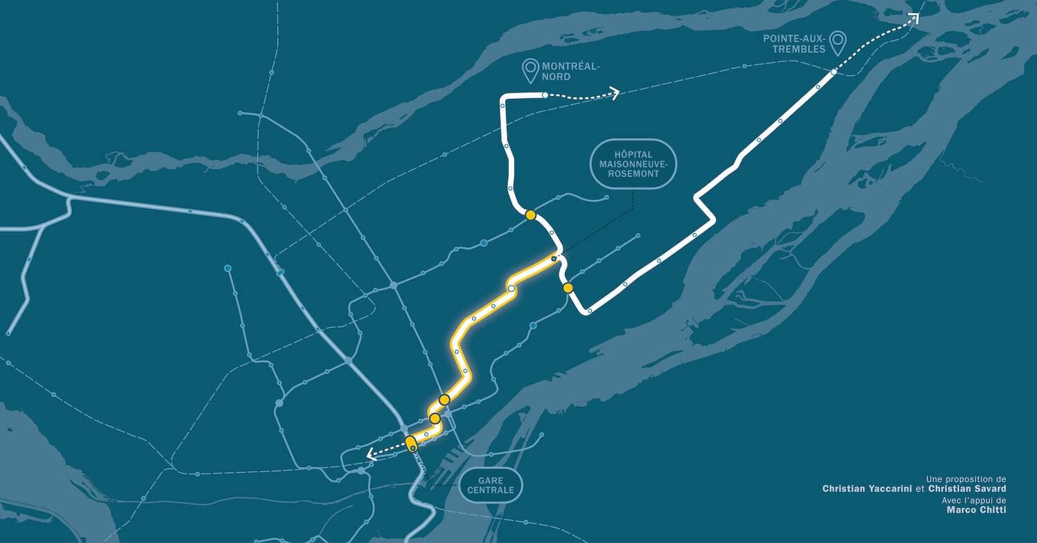 1. Une branche souterraine qui débuterait au centre-ville (à la gare centrale) et qui croiserait la ligne verte (à Saint-Laurent) et la ligne orange (à Sherbrooke) avant de traverser le quartier Rosemont pour se rendre jusqu’à l’hôpital Maisonneuve-Rosemont, où elle se diviserait en deux lignes.