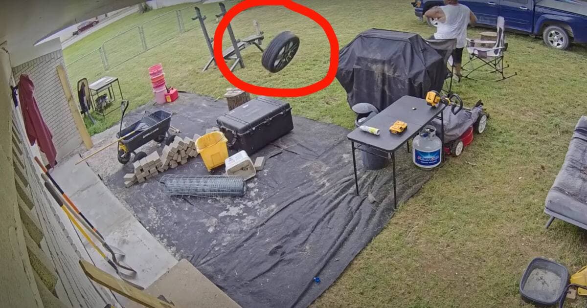 Un pneu en folie surgit de nulle part dans une cour arrière et démolit tout sur son passage