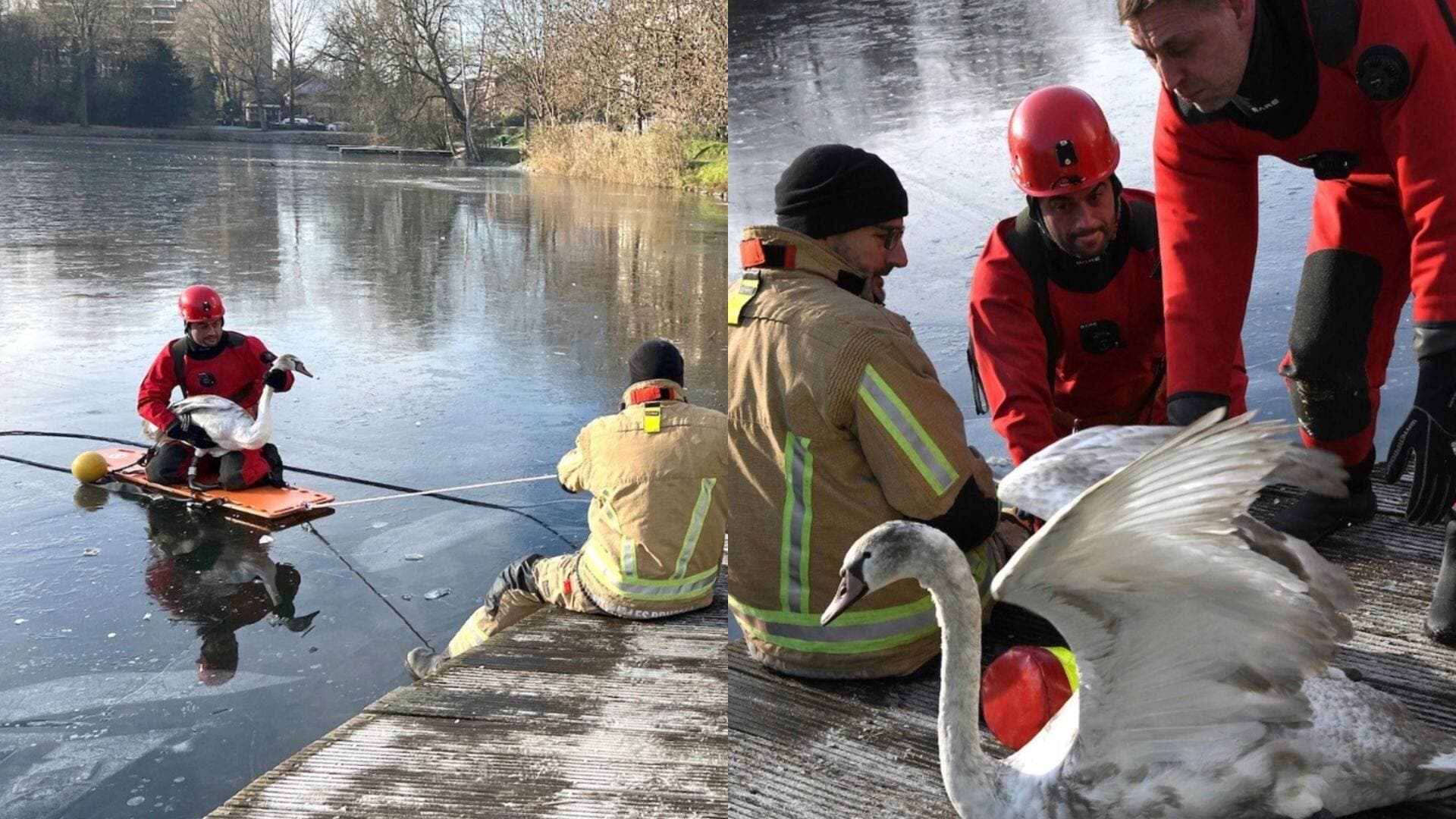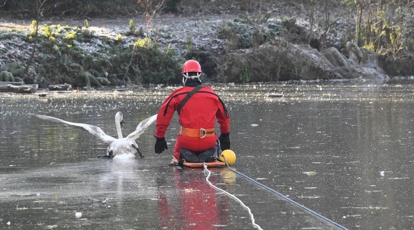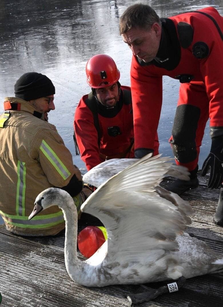 La population a alerté les autorités qui ont envoyé des plongeurs à la rescousse de l’oiseau pris dans la glace.