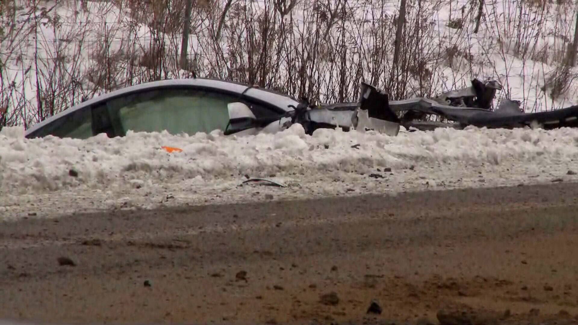 Les nombreux débris du véhicule couvraient une bonne portion de la chaussée après la collision.