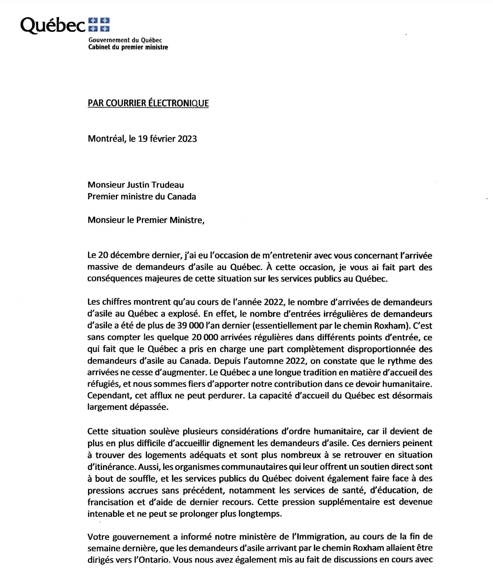 « Le Québec a une longue tradition en matière d’accueil des réfugiés, et nous sommes fiers d’apporter notre contribution dans ce devoir humanitaire. Cependant, cet afflux ne peut perdurer. La capacité d’accueil du Québec est désormais largement dépassée », signale le premier ministre.