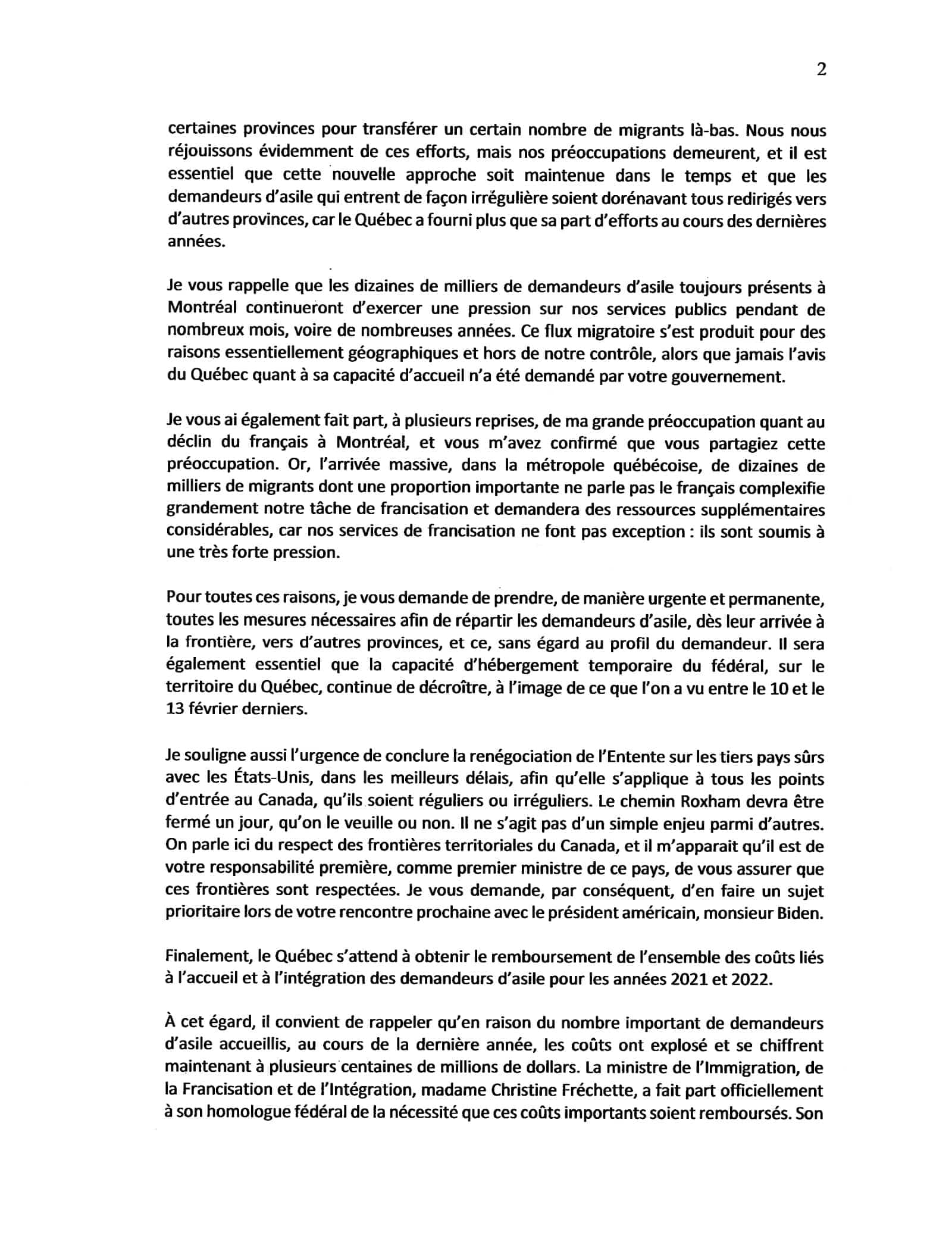 «Le chemin Roxham devra être fermé un jour, qu’on le veuille ou non. [...] Je vous demande, par conséquent, d’en faire un sujet prioritaire lors de votre rencontre prochaine avec le président américain, monsieur Biden. »