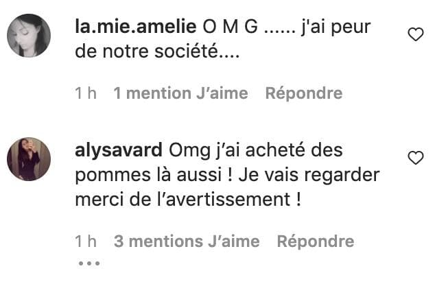 «Vérifiez toujours vos pommes!! Je mange ma pomme tranquillement et je trouve ÇA! Je suis dégoûtée... Et un peu traumatisée. J’appelle mon chum, as-tu mis des pommes aux enfants dans leurs lunchs? Chez Walmart de St-Jérôme, on me dit de me présenter avec la pomme et ma facture(!!). Rien de plus. Non, mais, je fais quoi?», écrit-elle en commentaire.
