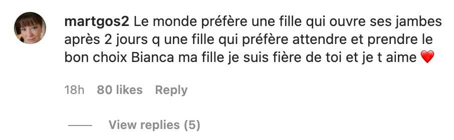 Elle est revenue voir Mathieu et l’a affronté en revenant sur ses propos. Ce dernier est allé chercher tous les gars pour qu’ils puissent répéter à Bianca ce qu’ils avaient dit dans son dos.
