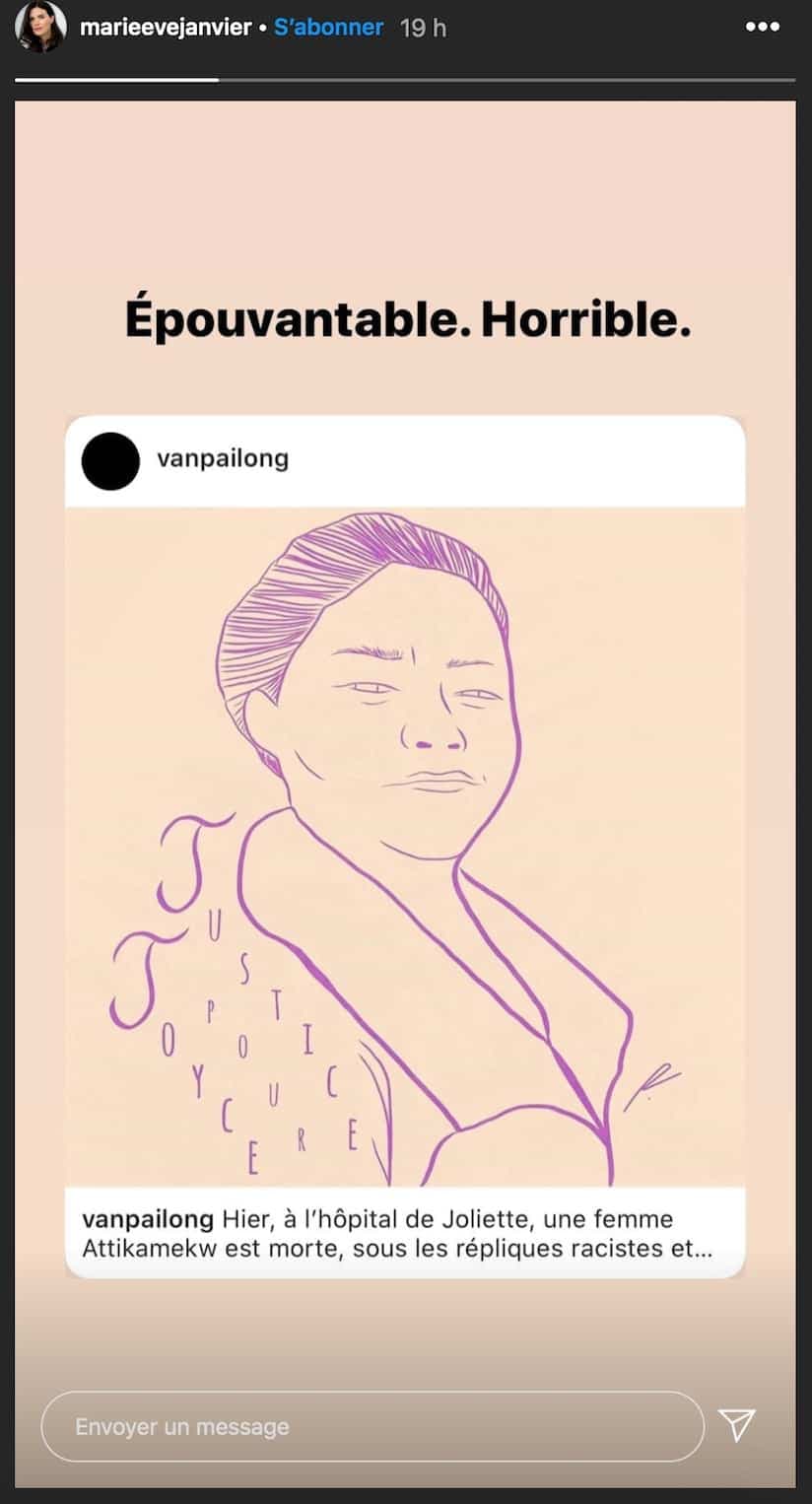 Depuis ce terrible événement, de nombreuses voix s'élèvent pour dénoncer le traitement réservé aux femmes autochtones, ainsi que, de manière plus large, le racisme envers les autochtones ici même, au Québec. Dans les dernières heures, de nombreuses vedettes québécoises ont choisi de profiter de leur plateforme pour dénoncer ces injustices, que ce soit en partageant des illustrations en sa mémoire, des articles ou même le lien vers la campagne de financement pour venir en aide à sa famille.