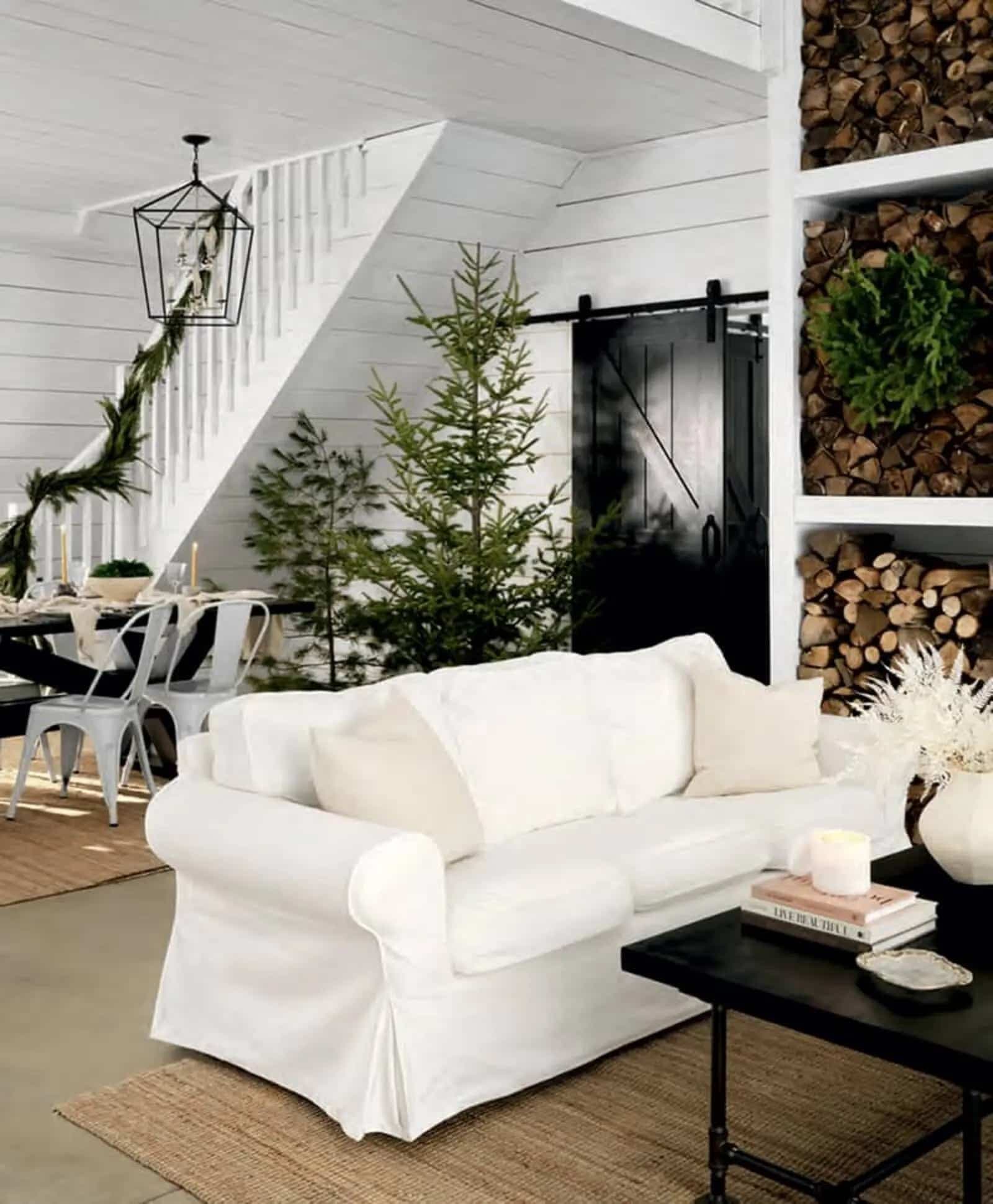 La table basse en bois massif est originale avec son piètement en tuyauterie: elle est l’œuvre du mari et des fils de Karyn, qui ne manquent pas de talent! Les guirlandes et les couronnes de sapinage s’agencent naturellement à ce décor de style campagnard.