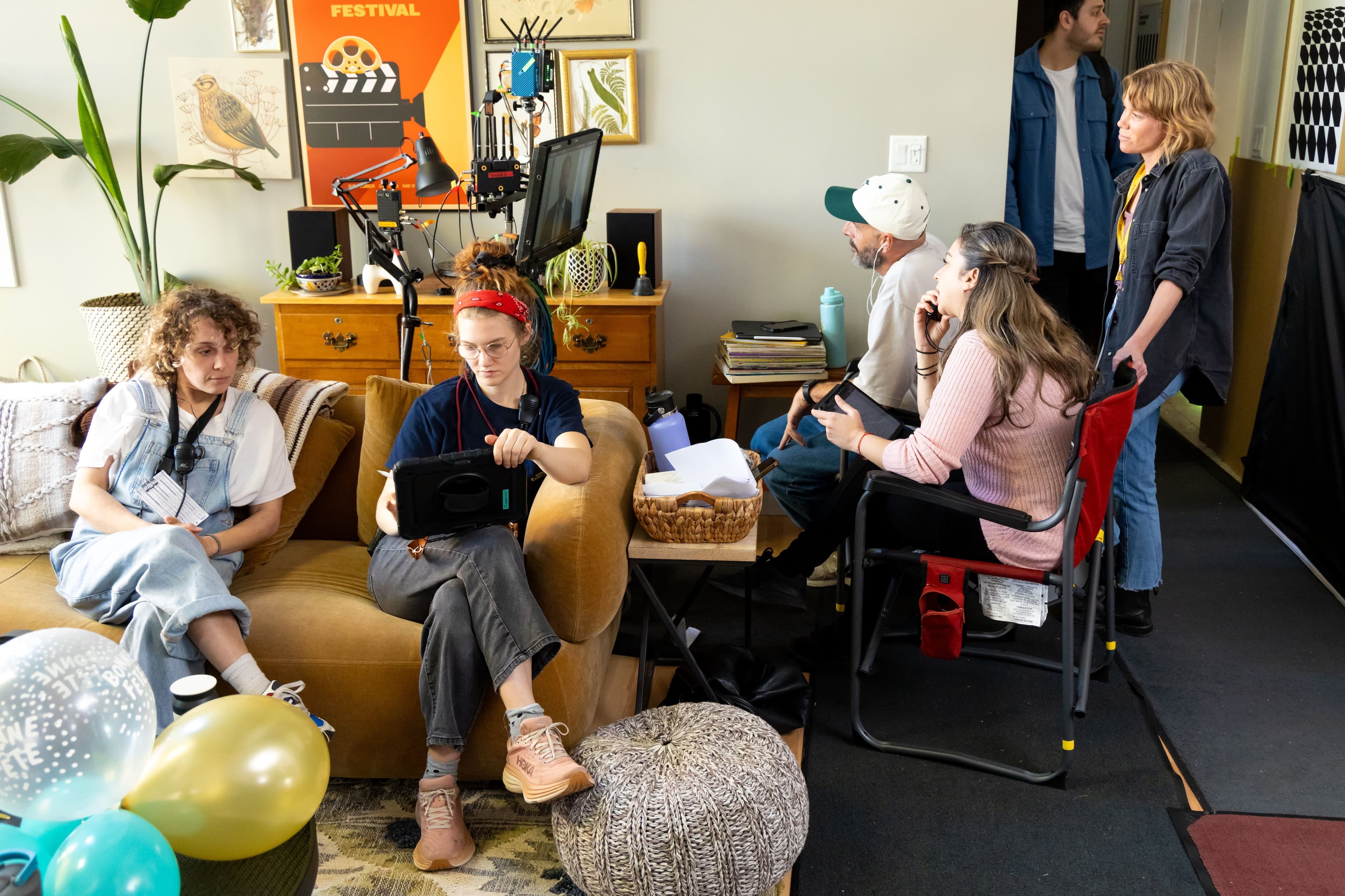 Sur place, nous avons déjà une bonne idée de ce à quoi nous attendre de cette production. Nous avons pu retrouver l’équipe dans une belle maison moderne sur la rive sud de Montréal. L’énergie est bonne et les rires se font entendre en catimini pendant la scène où le personnage de Justine se fait surprendre pour sa fête par ses deux meilleures amies, Kim et Frédérique, et son collègue de travail, un humoriste déchu interprété par Mani Soleymanlou. En quelques répliques, nous comprenons la dynamique de ce trio d’amies, les malaises, les sous-entendus, et certaines ambiguïtés qui passent dans le regard des actrices.