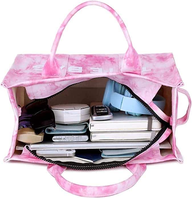 Ce sac fourre-tout possède un espace de rangement suffisamment spacieux pour pouvoir y mettre un ordinateur portable, des cahiers de notes ou des livres, un portefeuille et une trousse de maquillage. Il possède aussi une grande pochette à l'intérieur avec une fermeture éclair et deux compartiments.