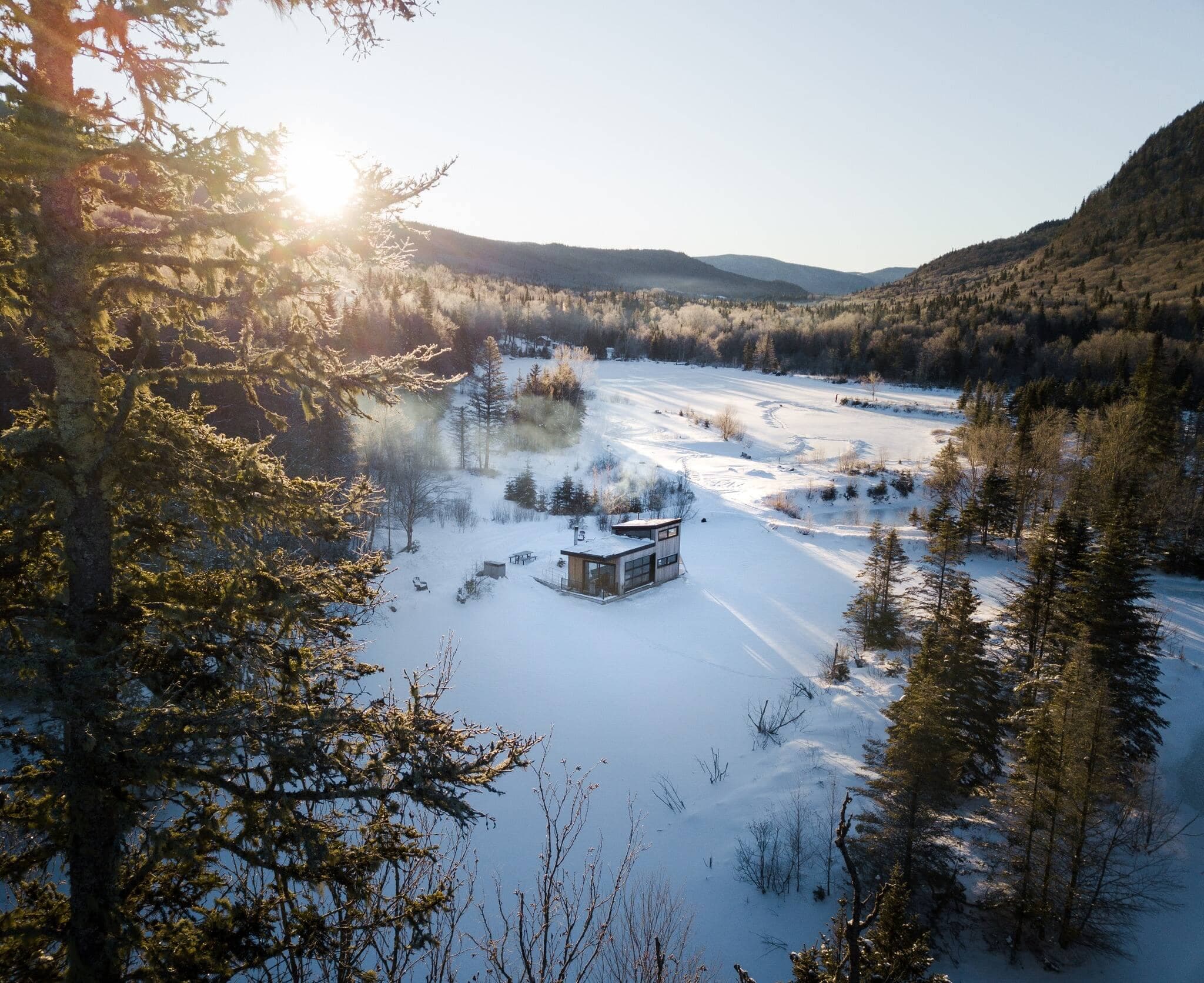 Perché à 550 mètres dans les montagnes, le chalet The Lagöm offre une vue imprenable sur l'hiver québécois. Puisqu'il fonctionne entièrement à l'énergie solaire, ce chalet locatif est écologique, accueillant et énergisant. Les hauts plafonds, le foyer intérieur et les fenêtres grandioses en font une destination hivernale de choix. Le chalet ne possède qu'une seule chambre, pouvant accueillir un couple à la recherche de tranquillité et de repos.