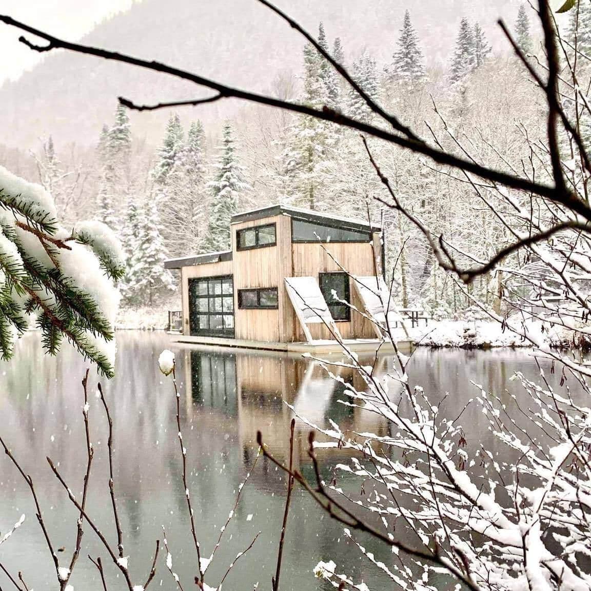 Situé au bord de l'eau, ce refuge en pleine nature a été pensé et conçu pour accueillir les familles, qui ont besoin d'un moment de répit. Il est équipé d'une table de babyfoot, de jeux de société pour les enfants, d'une grande télévision et d'une machine à pop corn. Accessible par un quai privé, le Lac Vingt-Sous se transforme en palais de glace, l'hiver venu.