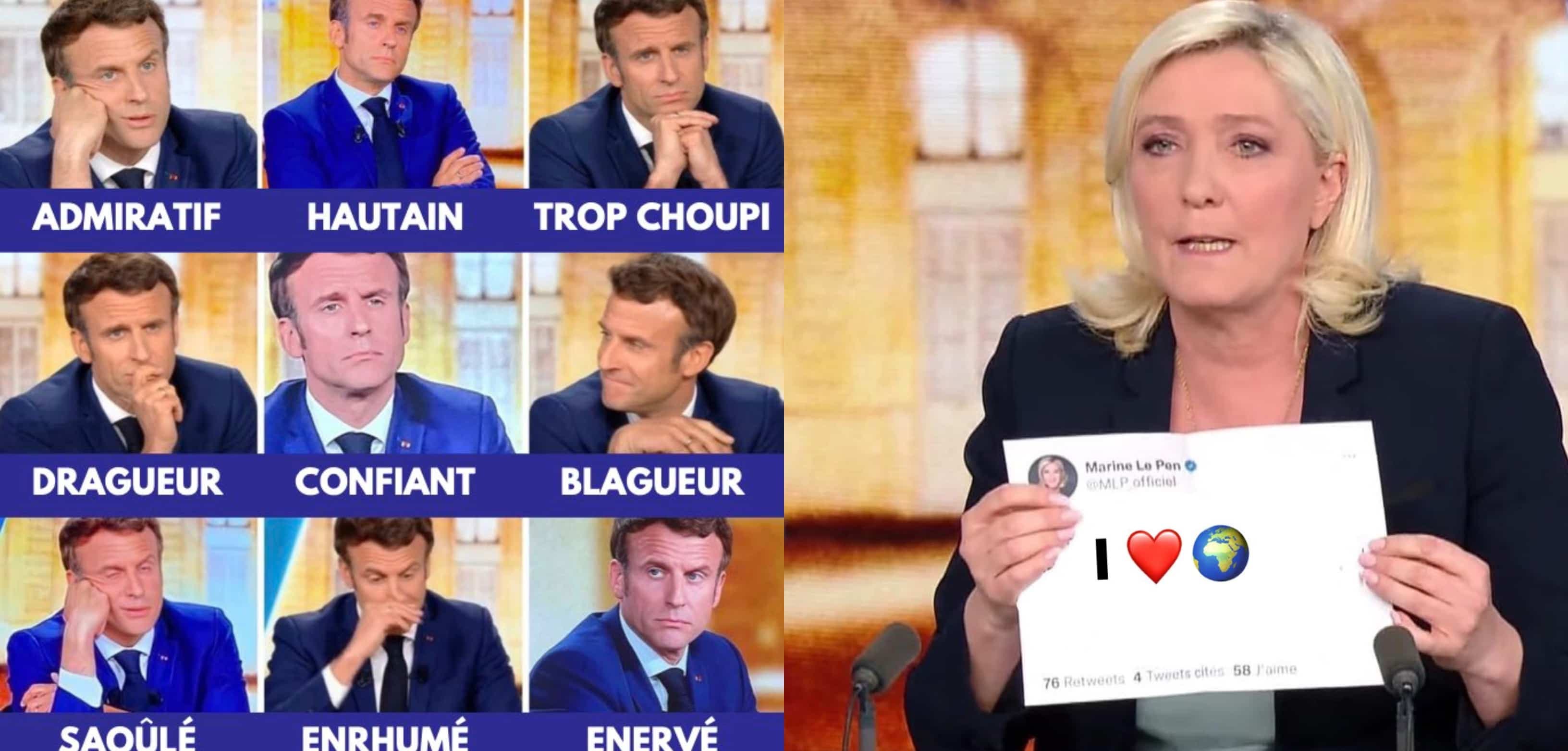 Pendant l’ultime débat de la présidentielle française, ce n’est pas les idées apportées par les deux candidats du deuxième tour qui ont fait jaser sur les réseaux sociaux, mais bien Emmanuel Macron et Marine Le Pen eux-mêmes. Retour sur quelques mèmes inspirés par les deux candidats.