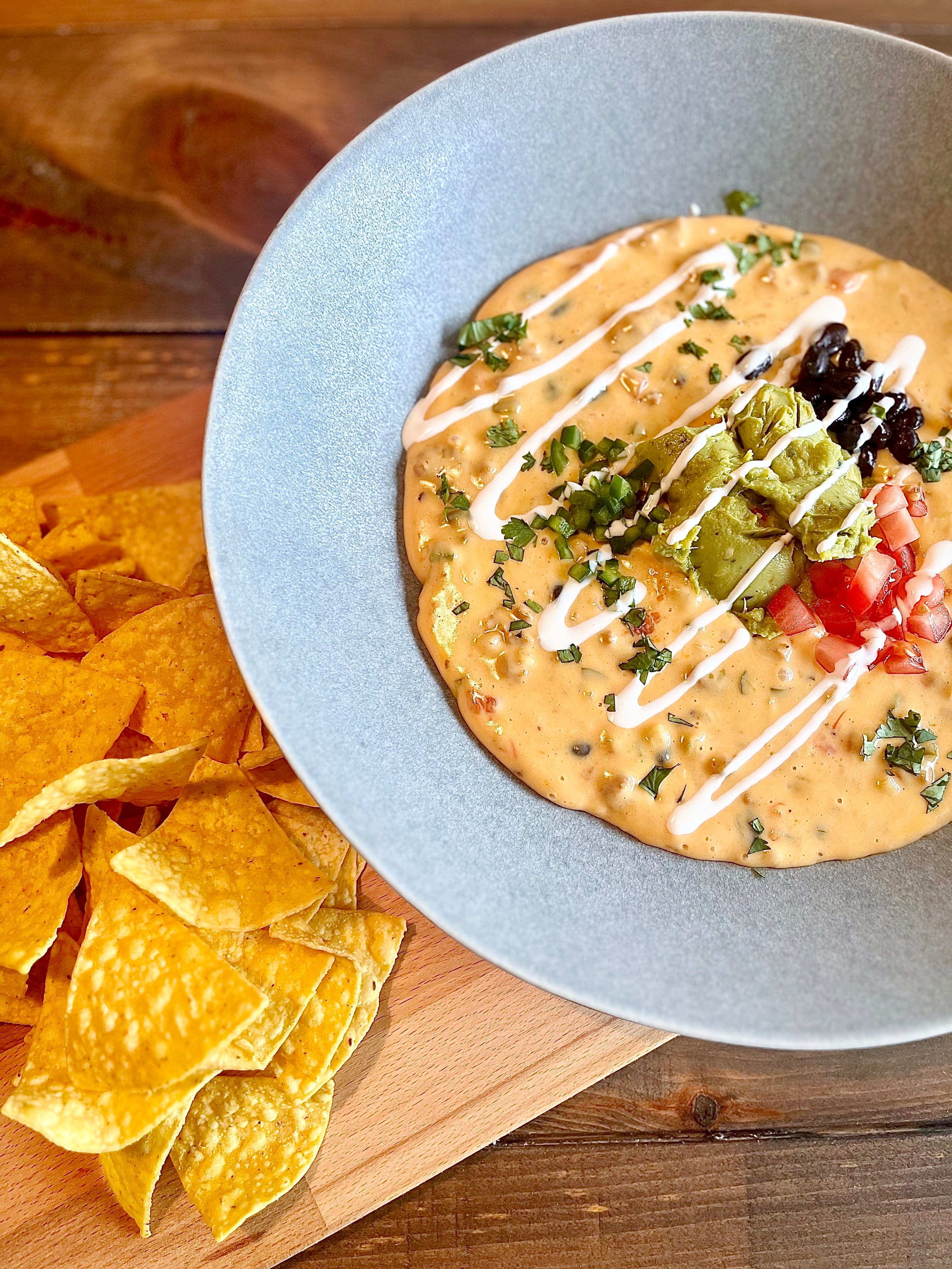 - Retirer du feu, et tout juste au moment de servir, ajouter un filet de crème sure en surface et la coriandre. Au choix, vous pouvez ajouter le guacamole au centre et les ingrédients mis de côté à l’étape 2. Servir accompagné de chips de maïs.