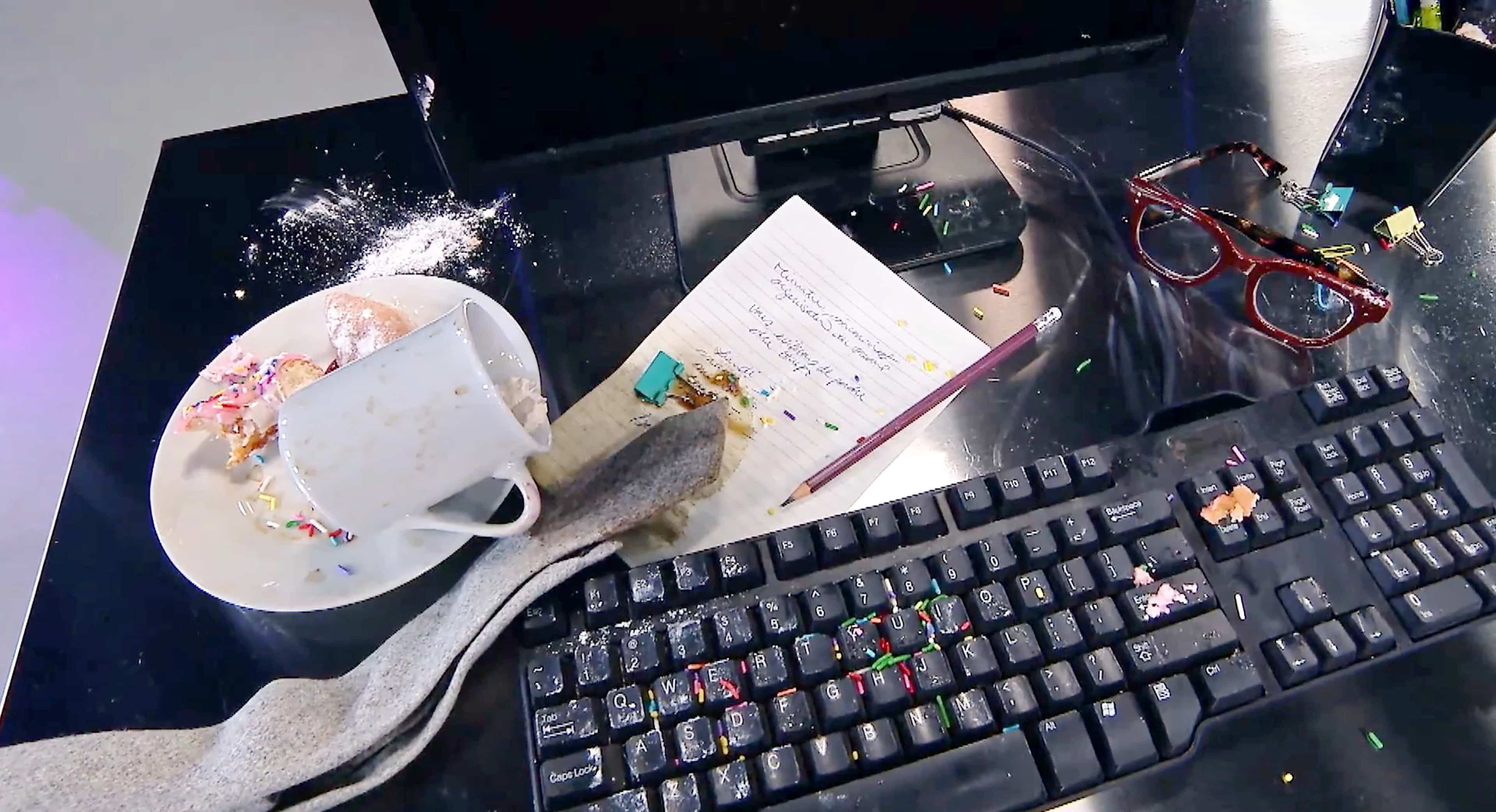 Cette semaine, les participants de Laver pour gagner ont dû nettoyer des restes de beignes de fête avec glaçage et confettis partout sur l’écran et le clavier, de la crème fouettée plein les crayons, une cravate imbibée de café... et tout ça en un temps record !