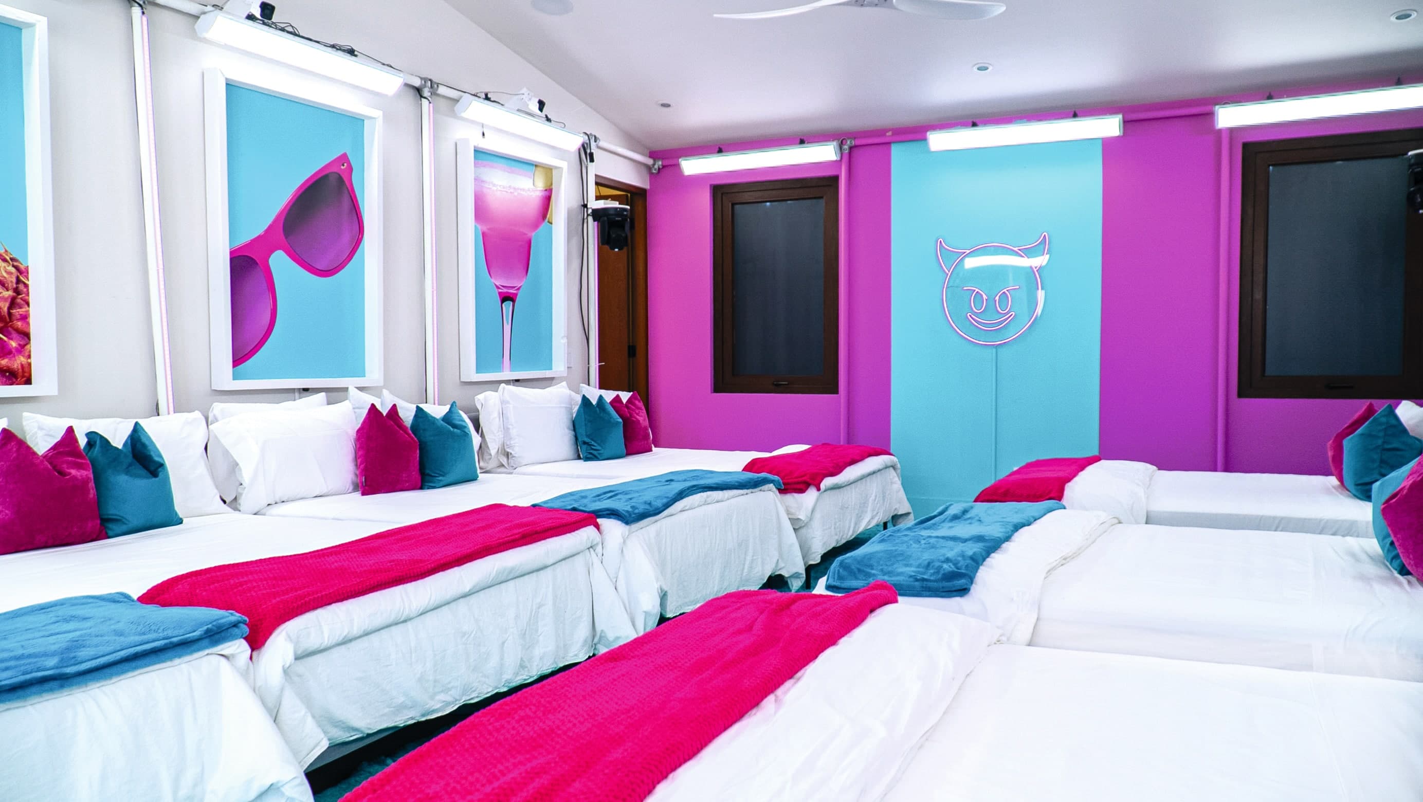 La chambre à coucher est spacieuse afin que les Insulaires puissent y prendre leurs aises. Elle comprend sept lits arborant les couleurs de l’île de l’amour!
